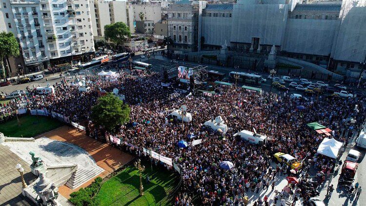 A las 18.33, los miles de asistentes comenzaron a cantar el Himno Nacional frente al escenario, donde colgaba una bandera gigante con la leyenda: “Dios te tiene en el cielo, nosotros en nuestros corazones”.