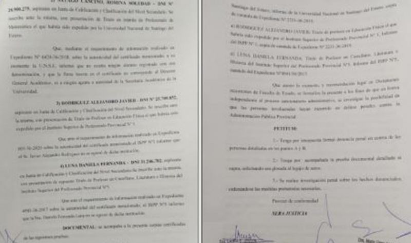 Oscar Rodríguez: ejerció como maestro de grado y como catedrático en el Agrupamiento Nº 86.121 de ciudad Capital, accediendo a ese cargo con la presentación del título de Profesor de 3º ciclo de la EGB y Educación Polimodal en Tecnología del Instituto de Estudios Superiores “Mater Dei”, ingresando en junio del 2014 y renunciando en agosto del mismo año. La casa de estudios informó al ser requerida por el sumario, que Rodríguez nunca fue alumno de la casa de estudios y que el analítico que había presentado también era apócrifo.