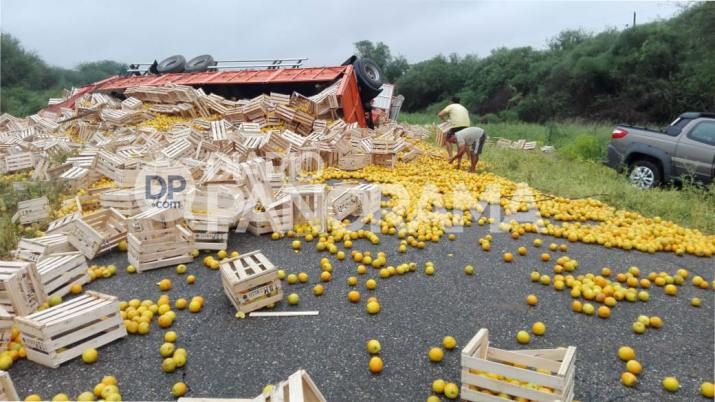 Se trata de un camión cargado de naranjas, el cual terminó dado vuelta tras el accidente producido alrededor de las 10 de la mañana, quedando toda la carga expandida en el asfalto.