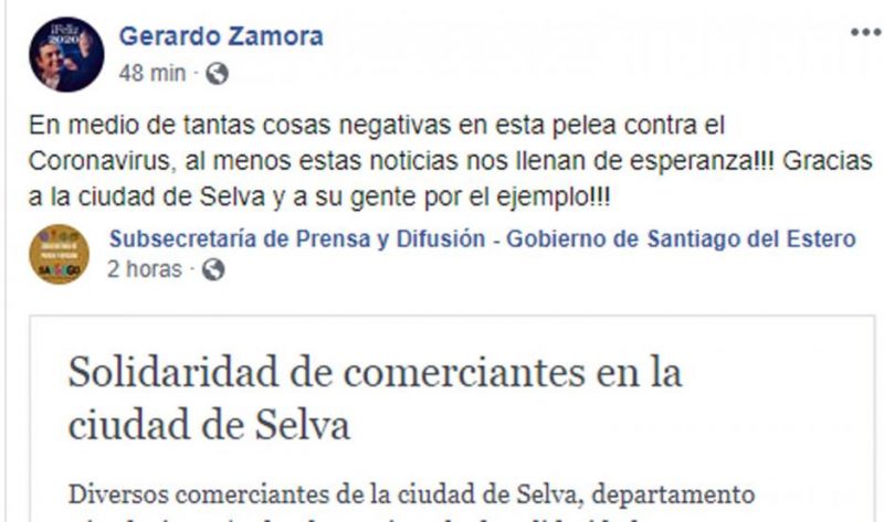 El gobernador de Santiago del Estero, Dr. Gerardo Zamora, utilizó las redes sociales para saludar a los vecinos de Selva, que se encuentra en cuarentena, aislada, desde antes que lo dispusiera la Presidencia de la Nación.