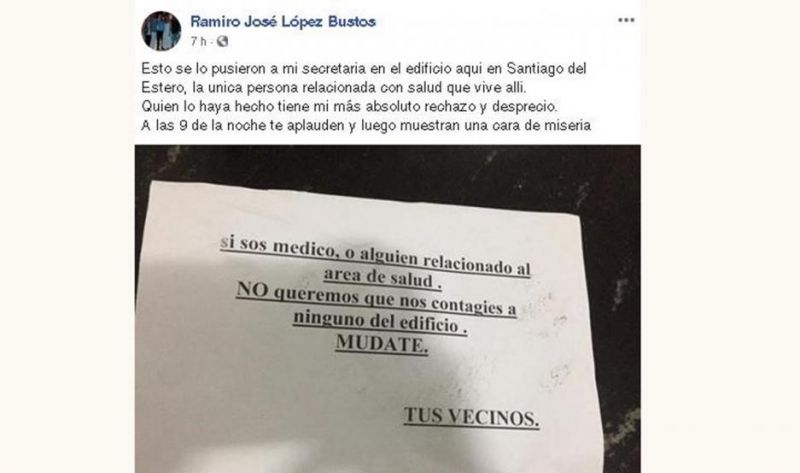 La destinataria es una mujer que trabaja como secretaria del Dr. Ramiro José López Bustos. Precisamente, el reconocido profesional santiagueño publicó en su muro de Facebook el cartel con esa amenaza y escribió ofuscado: “Esto se lo pusieron a mi secretaria en el edificio aquí en Santiago del Estero, la única persona relacionada con salud que vive allí. Quien lo haya hecho tiene mi más absoluto rechazo y desprecio. A las 9 de la noche te aplauden (modalidad que se realiza en todo el país como un reconocimiento al personal de salud que hace frente a la pandemia del coronavirus con su trabajo) y luego muestran una cara de miseria”.