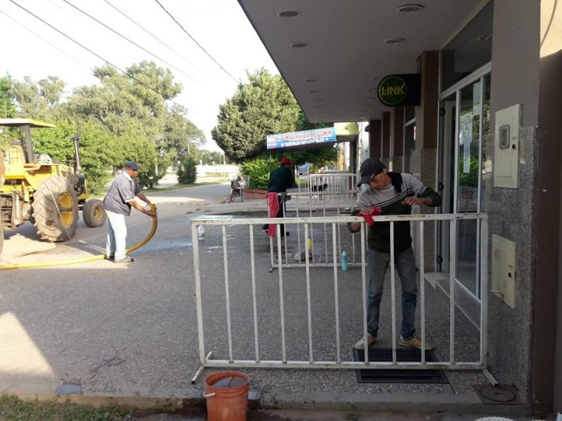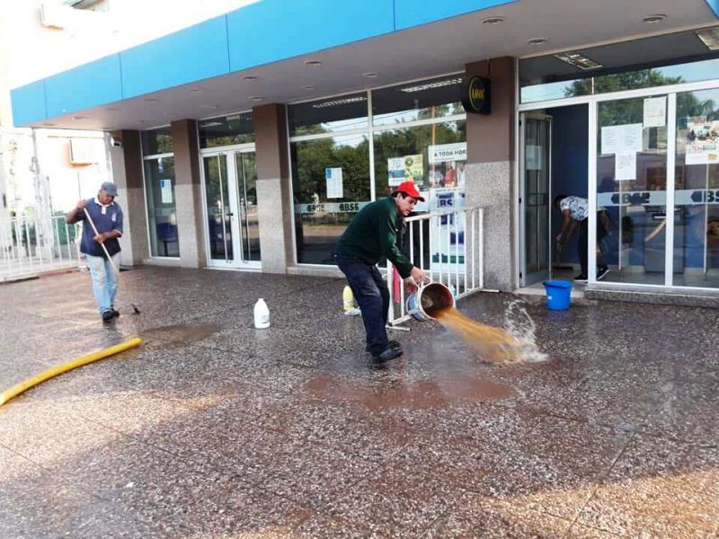 Se implementó como una forma de cuidado para la circulación urbana en zonas de tránsito necesario en la entidad bancaria. Estas tareas consisten en el lavado de espacios con agua y productos desinfectantes donde habitualmente transita la gente por cuestiones obligatorias.