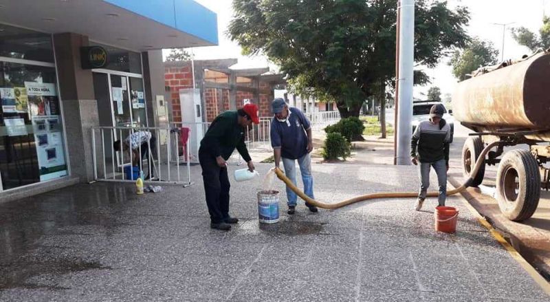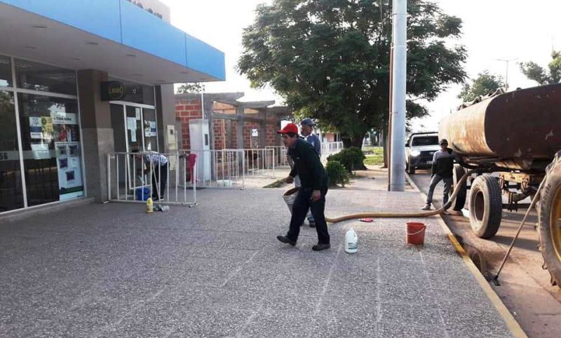 Tiempo de lectura: 53 segundosHoy viernes en horas de la mañana, la Municipalidad realizó la desinfección frente a la sucursal del Banco Santiago del Estero de nuestra ciudad, haciendo la correspondiente desinfección para evitar el contagio del COVID-19.