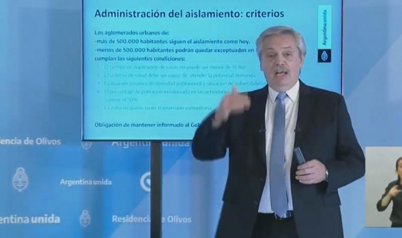 El mandatario sostuvo que en las ciudades de "más de 500 mil habitantes seguirán las restriccciones como hasta hoy", en la tercera etapa de la cuarentena que comienza el lunes, y que las localidades que tienen menor cantidad de población "pueden empezar a ser exceptuados", pero deben cumplir con requisitos para ello.