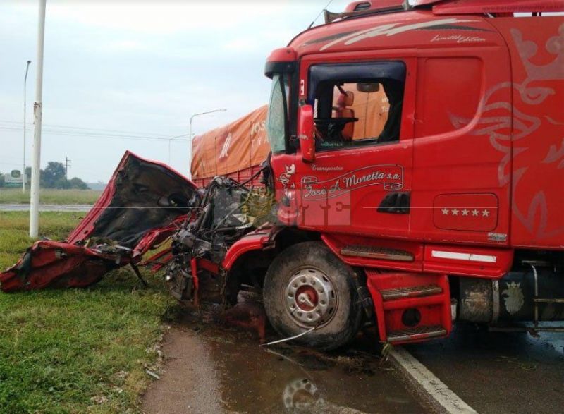 Por causas que se tratan de establecer una de los camiones embistió al otro en el cruce de las rutas, en el lateral izquierdo, siendo el más afectado el camión Scania, color rojo, que quedo con todo su frente completamente destruidos.