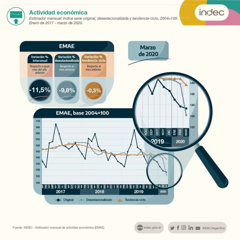 El Estimador Mensual de Actividad Económica (EMAE) mostró una caída del 9,8% respecto de febrero.