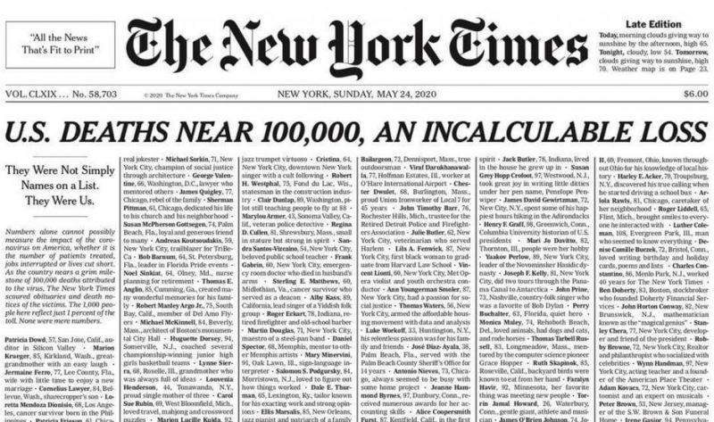 El New York Times publicó ayer una tapa en la que alertó que el país se acerca a las 100.000 víctimas por el avance del Coronavirus, publicando los nombres y una breve reseña de 1.000 de los fallecidos.