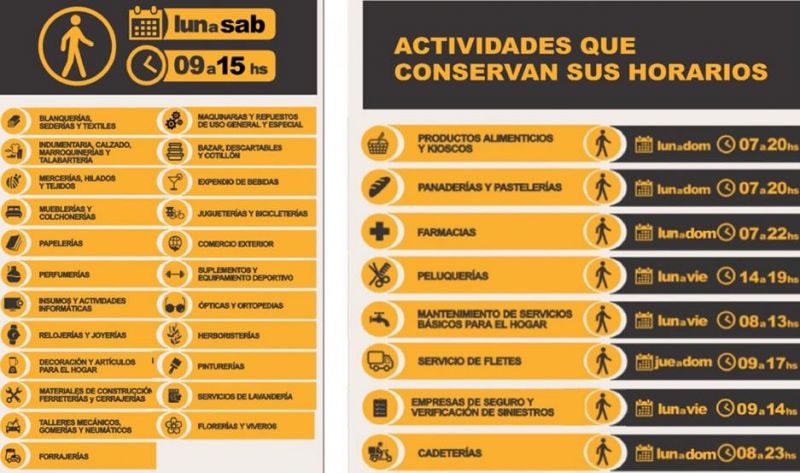 Los restaurantes, bares, pizzerías y heladerías podrán desarrollar sus actividades bajo la modalidad presencial de lunes a sábado inclusive, en el horario de 9 a 15, no pudiendo excederse en los días y horario fijados bajo ninguna circunstancia y/o justificación.