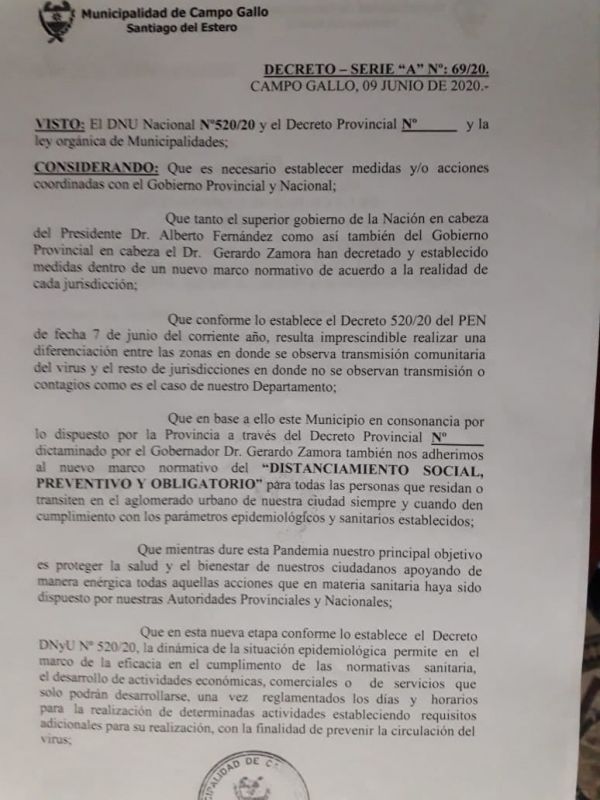 Tiempo de lectura: 2 minutos, 6 segundosEl primer mandatario de la Ciudad de Campo Gallo, Intendente José Fortunato Vittar, firmó un decreto en adhesión a las nuevas habilitaciones que regirán a partir de hoy en nuestra provincia