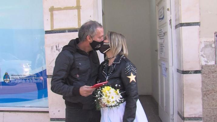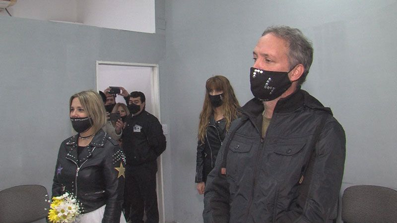 Ambos estuvieron con barbijo, y eligieron la temática rockera. Estuvieron acompañados por sus más íntimos, que al salir los aplaudieron, mientras mostraban la libreta.03-07-2020 Fuente y foto: diariopanorama.com