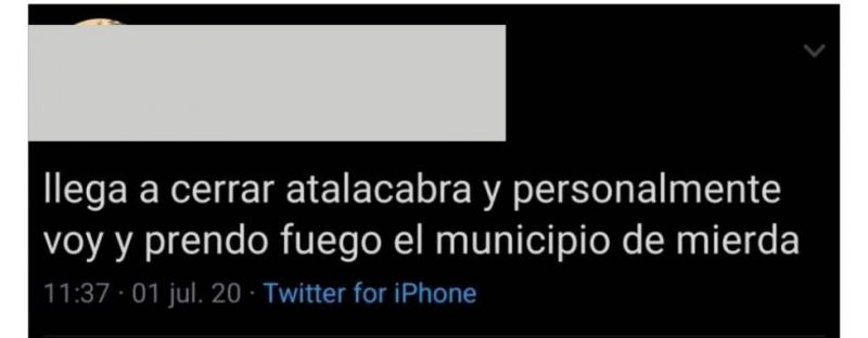 La policía fue informada sobre la publicación que un joven de 19 años realizó en las redes sociales (Twitter), que decía “llega a cerrar atalacabra y personalmente voy y prendo fuego el municipio de mierda”