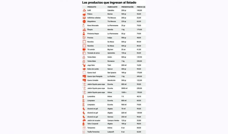 Los que ingresan, son 45 productos. Entre ellos, el paquete de 250 gramos de café molido La Planta y el paquete de té Big Ben de 25 unidades, ambos productos de Cabrales; cinco tipos de fideos de Morixe; yerba mate Unión, entre otros.l