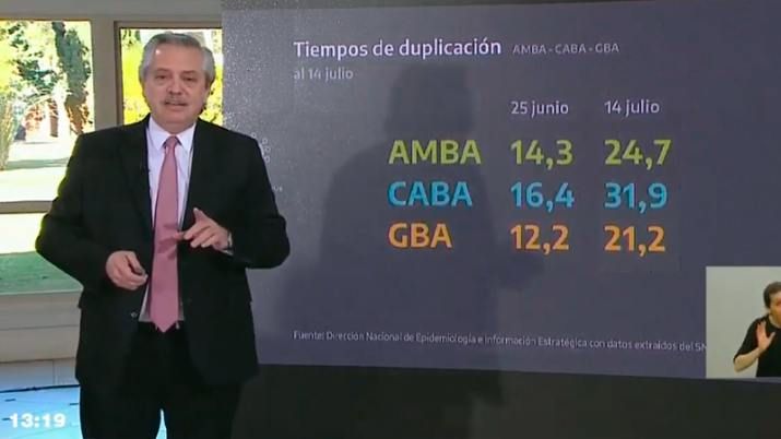 "Todos en el mundo han tenido marchas y contramarchas con esto", dijo el presidente al iniciar el mensaje. "Nuestra mayor preocupación fue que el sistema de salud se sature, fundamentalmente en el AMBA. Yo creo que en estos 14 días, a pesar de los números que ya conocen, donde hay un incremento en el número de contagios y fallecidos, aún así estamos en términos comparativos en una situación buena", agregó.