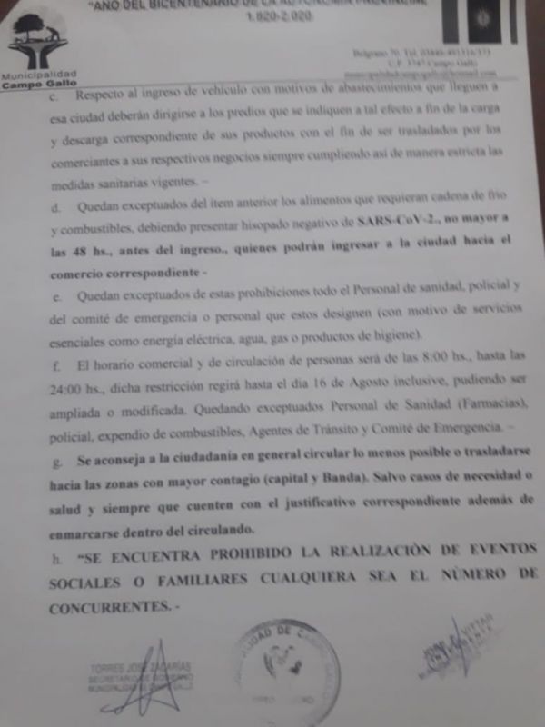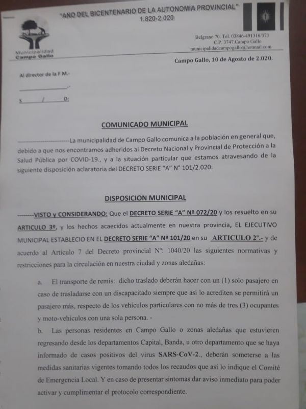 Tiempo de lectura: 2 minutosLa municipalidad de Campo Gallo comunica a la población en general que, debido a que nos encontramos adheridos al Decreto Nacional y Provincial de Protección a la Salud Pública por COVID-19., y a la situación particular que estamos atravesando de la siguiente disposición aclaratoria del DECRETO SERIE “A” N° 101/2.020: