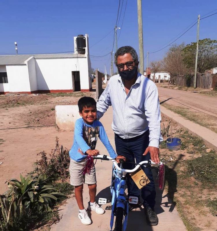 Thiago del Barrio Illia recibió su bicicleta ganada en el Concurso del Día del Niño, hizo la entrega el Intendente José Vittar