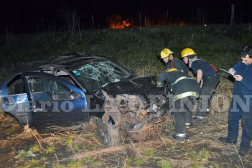 El accidente se produjo en la noche de este jueves, frente al ingreso del Instituto Nacional de Tecnología Agropecuaria (INTA) de Pergamino, donde se despistó un auto Renault Logan, dio varios tumbos y quedó volcado a varios metros de la ruta.