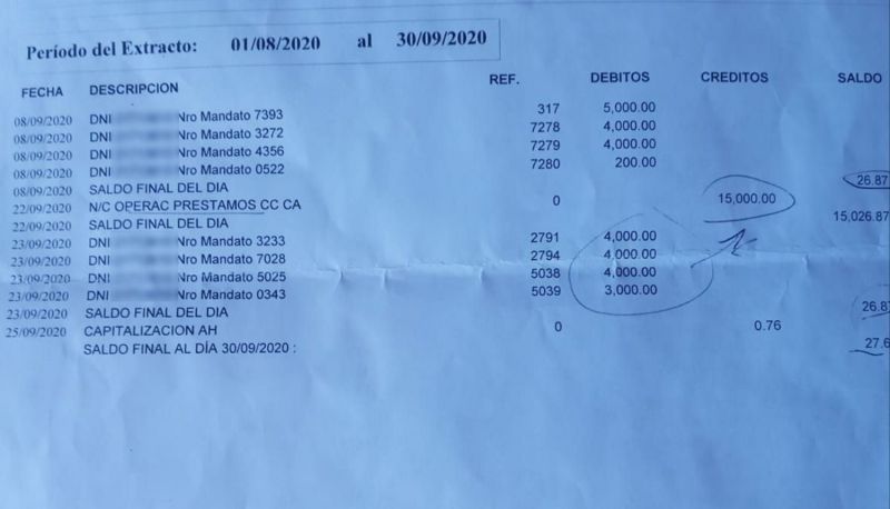 López le contó a El Tribuno que su tarjeta original está bloqueada y cuando fue a averiguar sobre este inconveniente se dio con la tremenda novedad que le habían vaciado alrededor de 100 mil pesos de su cuenta de haberes. "Todavía en el banco me dijeron que no me preocupe por el pago del préstamo por ahora, que hasta que no se resuelva la investigación, todavía no voy a pagar. O sea, que me robaron con operaciones bancarias y el banco no me da ninguna garantía de recuperarlo y además debo pagar 70 mil pesos de un préstamo que jamás solicité", dijo.