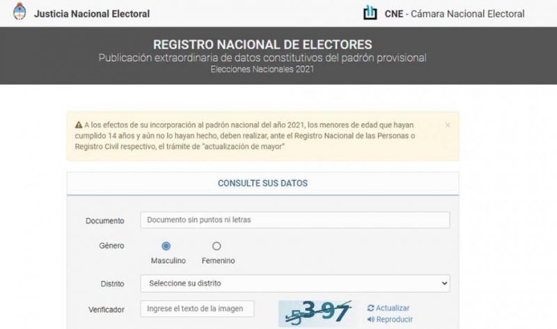 El organismo indicó que, para incorporar los datos al padrón nacional de 2021, "los menores de edad que hayan cumplido 14 años y aún no lo hayan hecho, deben realizar ante el Registro Nacional de las Personas o Registro Civil respectivo, el trámite de actualización de mayor".