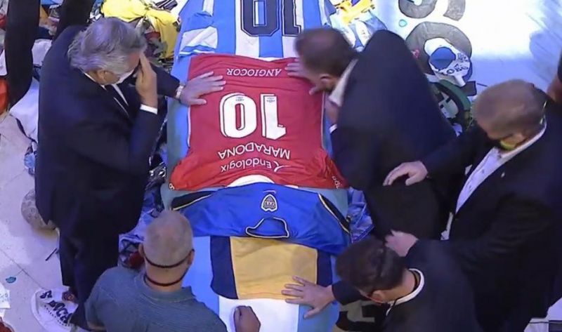 En simultáneo, del otro lado del féretro, el presidente de esa entidad, Cristian Malaspina, no pudo ocultar su emoción, se inclinó sobre los restos de Maradona y besó el sector donde Fernández ubicó la camiseta del Bicho.
