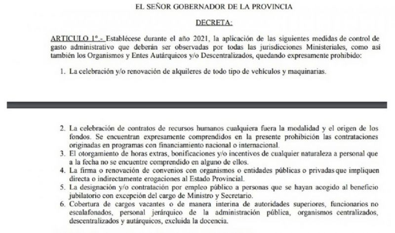 El Gobierno provincial adoptó mediante el decreto 31 una serie de medidas con el objetivo de limitar el gasto público entre las cuales se cuentan la prohibición de alquilar vehículos y maquinarias, el otorgamiento de horas extras y la celebración de nuevos contratos de recursos humanos, entre otras.