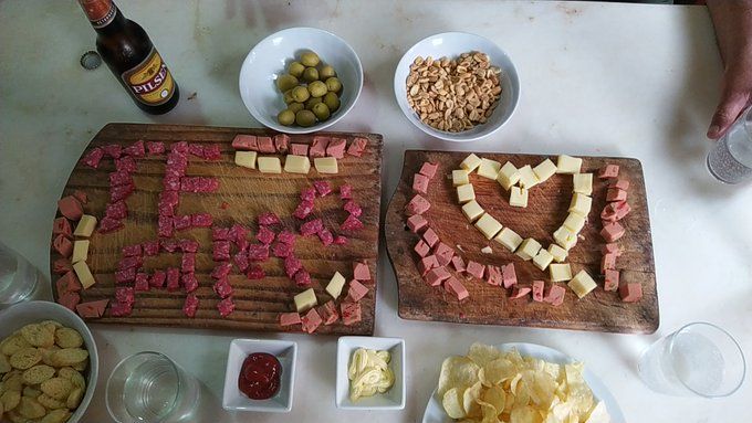 “Mis padres cumplen 21 años de casados y mi papá la espero así, CON UN TE AMO DE SALAME. No acepto menos”, escribió la chica y se llevó todos los aplausos.En la imagen, que recolectó más de 119 mil me gustas a las pocas horas, @valecurbelog capturó el regalo de su padre para su madre: una picada completa con la que había escrito “te amo” con salame y dibujado un corazón con jamón y queso.