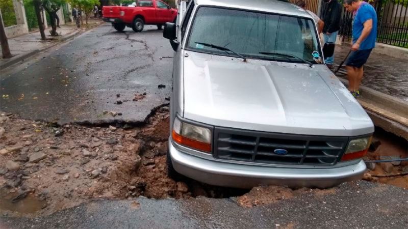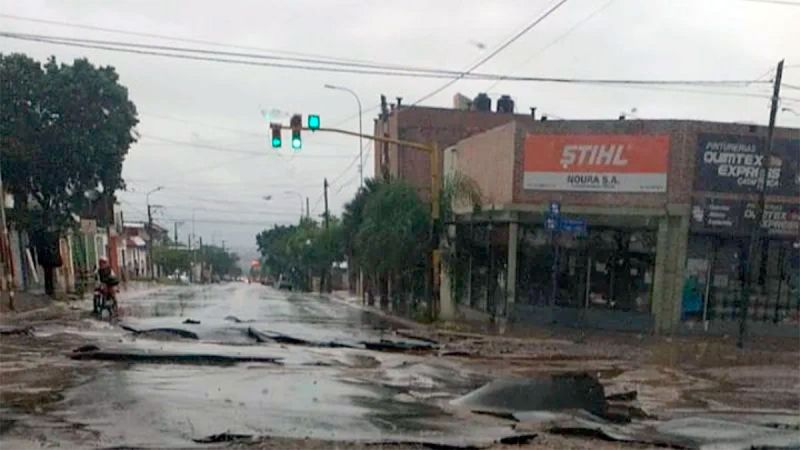 En cuestión de minutos cayó una gran cantidad de agua y las calles se convirtieron en verdaderos ríos, generando complicaciones para el tránsito y daños en el asfalto. Varios vehículos fueron arrastrados por el agua en las calles céntricas de la ciudad.