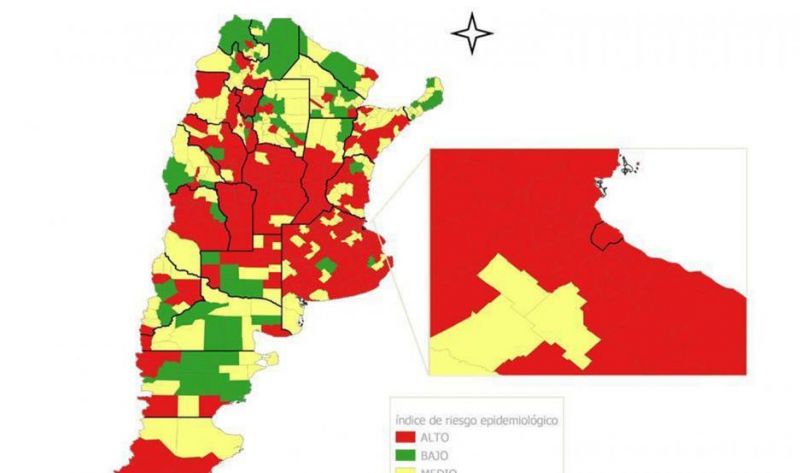 De acuerdo con el "semáforo epidemiológico", (color rojo: riesgo alto, color amarillo: riesgo medio, color verde: riesgo bajo) hubo un crecimiento del 87% en cuanto al total de departamentos comprometidos.