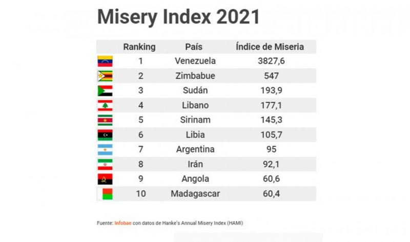 Con 95 puntos, la Argentina volvió a aparecer en el Top 10 del ranking mundial de Miseria, edición 2020, que encabeza Venezuela y en la que comparte el lote con países afectados por gravísimos conflictos bélicos y civiles.