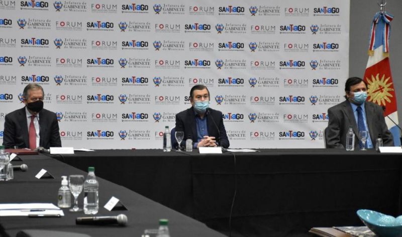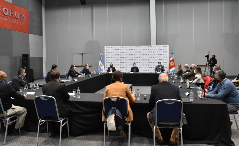 El gobernador Gerardo Zamora, acompañado por el jefe de Gabinete Elías Suárez y otro funcionarios, mantuvieron un encuentro con representantes del sector comercial, así como gastronómico, hotelero y de turismo de la provincia, para dialogar en torno a medidas que respalden estas actividades afectadas directamente por la pandemia de coronavirus.
