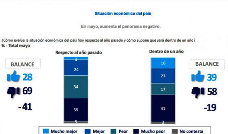 La encuesta también indagó a futuro. En este sentido, respecto de cómo suponen los entrevistados que será la situación económica del país dentro de un año, un 55% respondió que entre “peor y mucho peor”, a la vez que este porcentaje fue el más alto detectado no sólo en lo que va de este año sino también desde mayo de 2020.