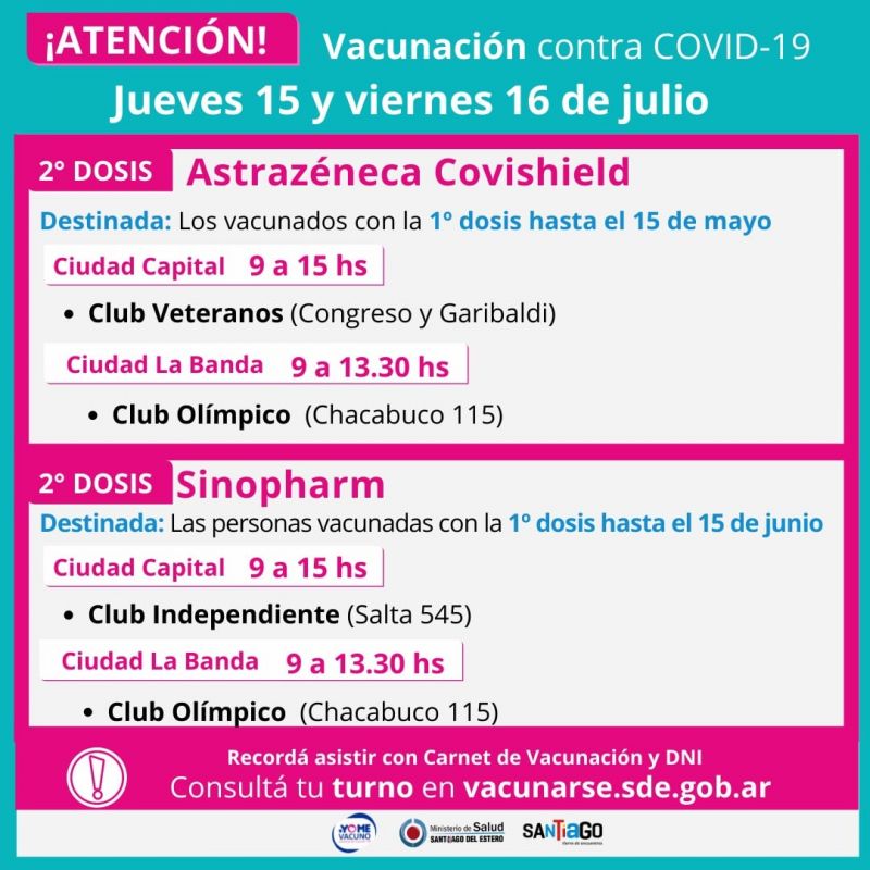 Puede ser una imagen de una o varias personas y texto que dice "2° DOSIS ¡ATENCIÓN! Vacunación contra COVID-19 Jueves 15 y viernes 16 de julio Astrazéneca Covishield Destinada: Los vacunados con la 1° dosis hasta el 15 de mayo hs Ciudad Capital Club Veteranos (Congreso Garibaldi) Ciudad La Banda 13.30 hs Club Olímpico (Chacabuco 115) 2° DOSIS Sinopharm Destinada: Las personas vacunadas con la 1° dosis hasta el 15 de junio Ciudad Capital Club Independiente (Salta 545) Ciudad La Banda 15 hs 9 13.30 hs Club Olímpico (Chacabuco 115) Recordá asistir con Carnet de Vacunación y DNI Consultá tu turno en vacunarse.sde.gob.ar MinistereS SANTiaGo"