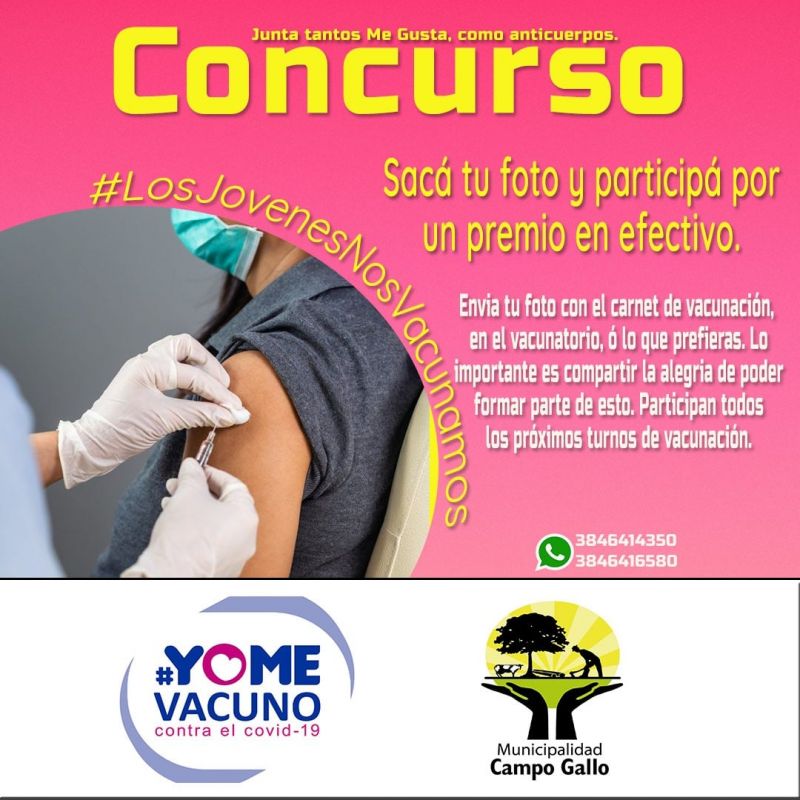 La Municipalidad de Campo Gallo convocó a los vecinos a participar del concurso virtual “Los jóvenes nos vacunamos”, que ofrece importantes premios de dinero en efectivo para quienes sumen más “Me gusta” en las fotos que envíen para ser publicadas hasta las 00:00 hs del viernes próximo en la página oficial de la comuna en la red social Facebook.