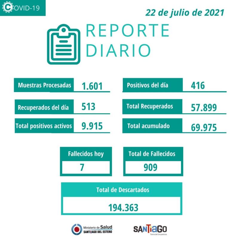 Puede ser una imagen de texto que dice "OVID-19 22 de julio de 2021 REPORTE DIARIO Muestras Procesadas 1.601 Positivos del día Recuperados del día 416 513 Total positivos activos Total Recuperados 9.915 57.899 Total acumulado 69.975 Fallecidos hoy 7 Total de Fallecidos 909 Total de Descartados 194.363 Ministerio Salud SANTHAGO DEL ESTERO SANTiaGo TiraEct"