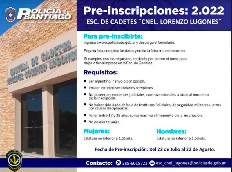 La Jefatura de Policía informó que a partir de este jueves 22 de julio y hasta el 22 de agosto inclusive, se abre la preinscripción vía online al Ciclo Lectivo 2022 para todos aquellos jóvenes que deseen formarse como oficiales de la Policía de la provincia, en la Escuela de Cadetes “Coronel Lorenzo Lugones”.