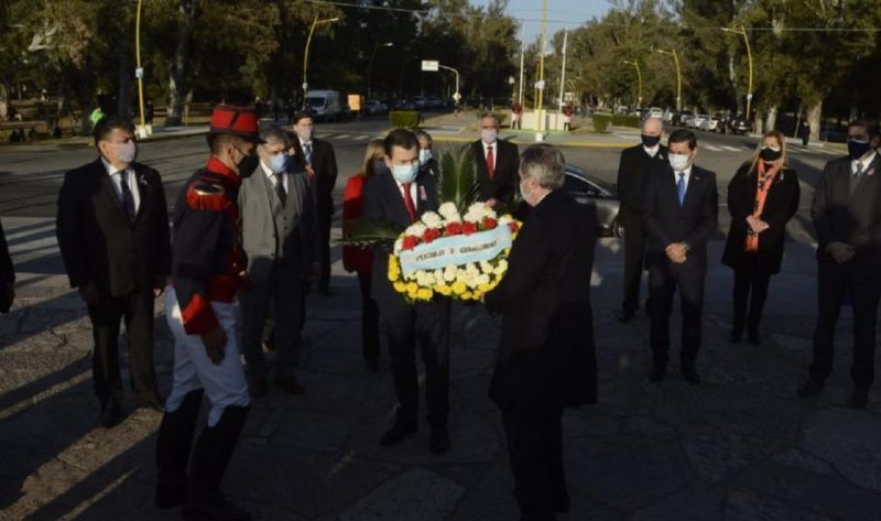 En este marco, se realizó el acto protocolar que encabezó el gobernador Gerardo Zamora frente al monumento a Francisco de Aguirre, donde entregó una ofrenda floral.