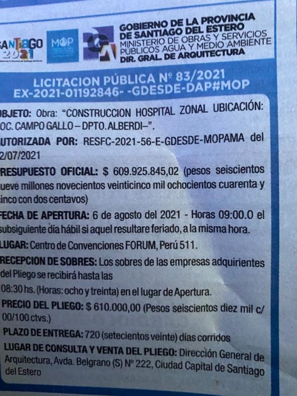 El próximo viernes 6 de agosto se realizará la apertura de sobres de la licitación para la construcción de un nuevo edificio del Hospital Zonal de Campo Gallo, con un presupuesto que ronda los $ 610 millones.