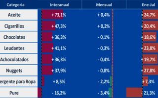 En otros puestos relevantes se ubicaron la lavandina (7,3%), el café y la mayonesa (ambos con 7,2%), el fernet (6,9%) y el papel higiénico (6,3%). En lo que respecta a los incrementos interanuales, la nómina está liderada por los productos de copetín o “snacks”, con un 135,4% en relación con los niveles de julio de 2020. En el segundo lugar se anotaron los vinos (98,4%) y luego siguieron la cerveza (77,9%), el aceite (73,1%), el arroz (64,3%) y las salchichas (63,4%).Como “nota llamativa”, Focus Market destacó ocho productos con caídas de precios en el mes: los ya mencionados flanes (-27,5%), las salsas preparadas (-3,5%), el puré (-3,4%), el detergente para la ropa (-2,2%), los bocaditos de pollo o “nuggets” (-0,8%), los productos achocolatados (-0,4%), las harinas leudantes (-0,3%) y los chocolates (-0,1%).