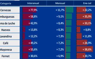 El listado de los productos de consumo masivo está encabezado por una bebida alcohólica (la cerveza) y tres alimentos (hamburguesas, crema de leche y huevos), ubicándose la lavandina en el quinto puesto como el primer artículo de limpieza. Según el informe de Focus Market, el incremento mensual de la cerveza fue del 11,7%, el de las hamburguesas del 9,1%, el de la crema de leche del 8,4% y el de los huevos del 8,3%.