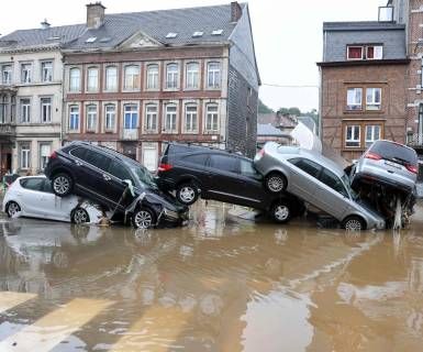 Autos apilados por las inundaciones en una rotonda en Verviers, Bélgica, el 15 de julio de 2021.