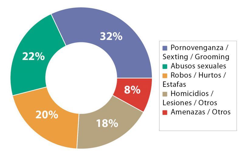 Estos ilícitos, que algunos llaman cibernéticos, tienen como víctimas tanto a personas —de distintas edades— como a organismos y empresas, ya que abarca desde los delitos contra la integridad sexual, violación de la intimidad o privacidad —pornovenganza, sexting, grooming—, la pornografía infantil, la promoción y facilitación de la prostitución; hasta los que se producen con finalidad económica, como los ataques a bancos de datos, fraudes y daños informáticos, entre otros.