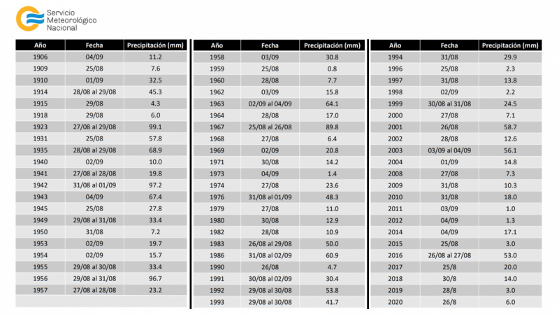 El resultado del análisis demostró que, en los 115 años de registro, en 64 oportunidades (55% de los casos) se produjeron tormentas en esas fechas, aunque no siempre estuvieron asociadas a precipitaciones intensas y/o abundantes.