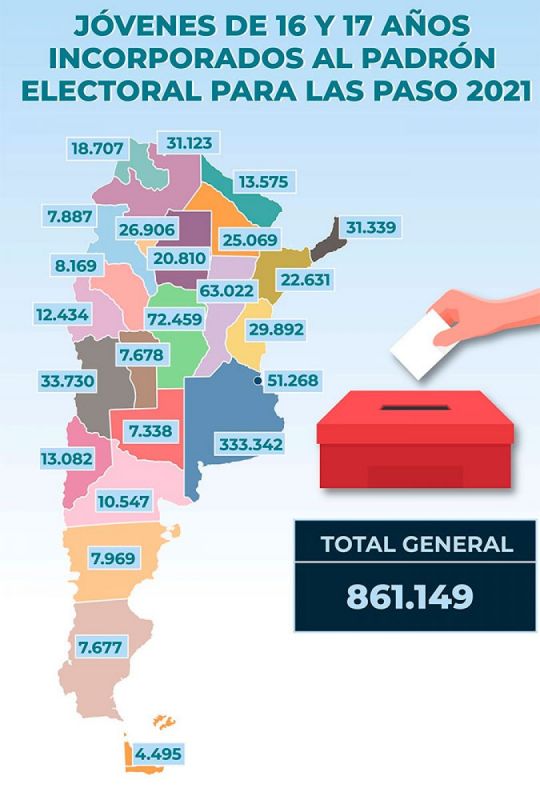 Un total de 861.149 jóvenes de 16 y 17 años, nacidos en 2004 y 2005, se incorporaron al padrón electoral nacional y votarán por primera vez este domingo en las PASO, informó la Cámara Nacional Electoral (CNE).