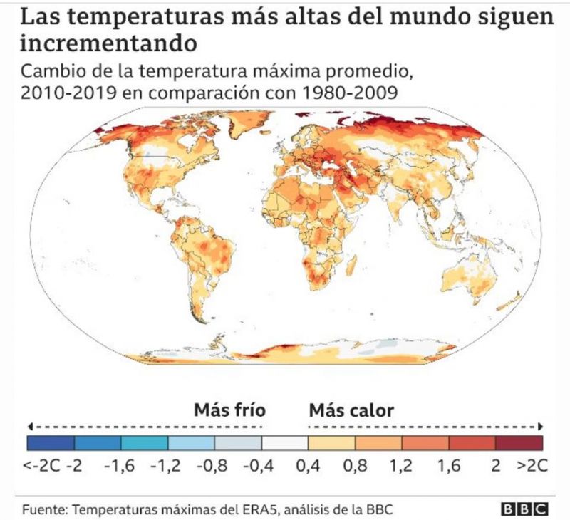 El análisis de la BBC también encontró que en la última década, las temperaturas máximas aumentaron 0,5° C en comparación con el promedio a más largo plazo registrado entre 1980 y 2009.