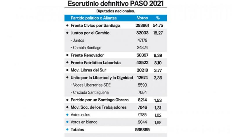 La Justicia Federal finalizó en la víspera el escrutinio definitivo de las Primarias Abiertas Simultáneas y Obligatorias (Paso) celebradas el 12 de septiembre en Santiago del Estero, cuyos guarismos confirmaron el triunfo categórico del Frente Cívico por Santiago que obtuvo un total de 293.961 sufragios sobre 536.865 votos totales con más del 55% de los votos.