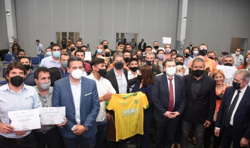 El gobernador Gerardo Zamora y el ministro de Turismo y Deportes de la Nación, Matías Lammens, entregaron este martes por la noche subsidios a 55 instituciones de Santiago del Estero que accedieron a los beneficios del Programa Clubes en Obra.