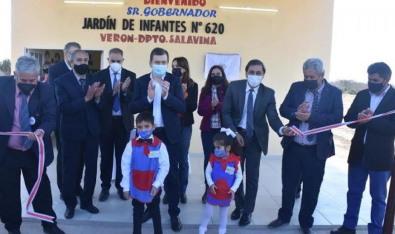 La jornada de inauguraciones comenzó en la localidad de Verón, donde fue habilitado el nuevo edificio del Jardín de Infantes Nº 620, anexo de la Escuela Nº 893, que cuenta con una sala, sanitarios, galería cubierta, aljibe y cerca perimetral. Además de todo el equipamiento necesario para el Nivel Inicial.