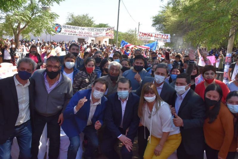El mandatario llegó acompañado por el vicegobernador Carlos Silva Neder y miembros de su gabinete, quienes fueron recibidos por el intendente José Luis Artaza y una gran cantidad de vecinos reunidos en el barrio Polígono que celebraron la llegada de Zamora, luego de haber postergado este acto el pasado domingo por razones de salud.