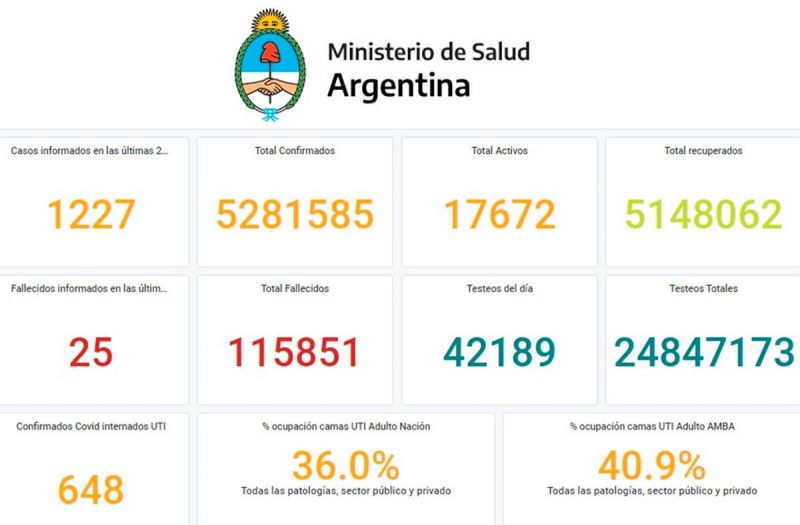 Este viernes, en Argentina se registraron 1.227 nuevos casos, lo que aumenta el total de positivos desde el inicio de la pandemia en el país a 5.281.585. Los mayores números de contagios se dieron en: la Provincia de Buenos Aires (473), Corrientes (181) y la Ciudad (171).