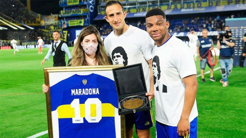 Los dos equipos salieron al campo de juego vistiendo camisetas blancas también con el rostro del "10". Y el capitán de Boca, Carlos Izquierdoz, junto con el colombiano Frank Fabra, le entregaron una camiseta y una plaqueta recordatoria a Dalma Maradona, la hija mayor del astro, la que solía acompañarlo a los partidos.