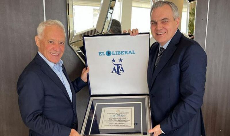 Durante un ameno encuentro entre ambos empresarios, el dirigente deportivo entregó la plaqueta de la AFA que reza: “La Asociación del Fútbol Argentino al Diario EL LIBERAL en su 123 aniversario, por su denodado aporte para difundir y elevar los valores de nuestro amado deporte: Claudio F. Tapia, presidente”.